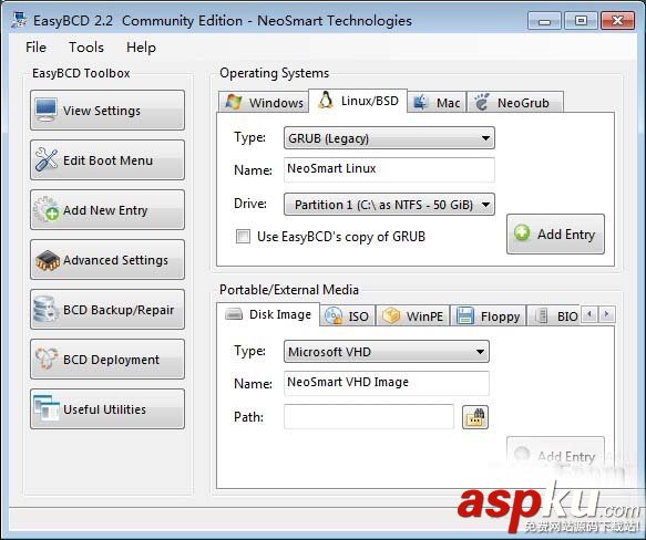 6.裝好系統后,重啟,選擇進入Win7,打開easyBCD,"Add New Entry"--"Linux/BSD"--"Add Entry",
