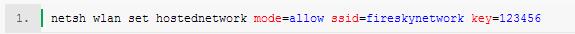 netsh wlan set hostednetwork ssid=firesky key=123456 設置網絡名為firesky密碼為123456