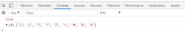 var regex = //1/2/3/4/5/6/7/8/9/;console.log( regex.test("/1/2/3/4/5/6/7/8/9") ); console.log( "/1/2/3/4/5/6/7/8/9".split("") );chrome瀏覽器打印的結果: