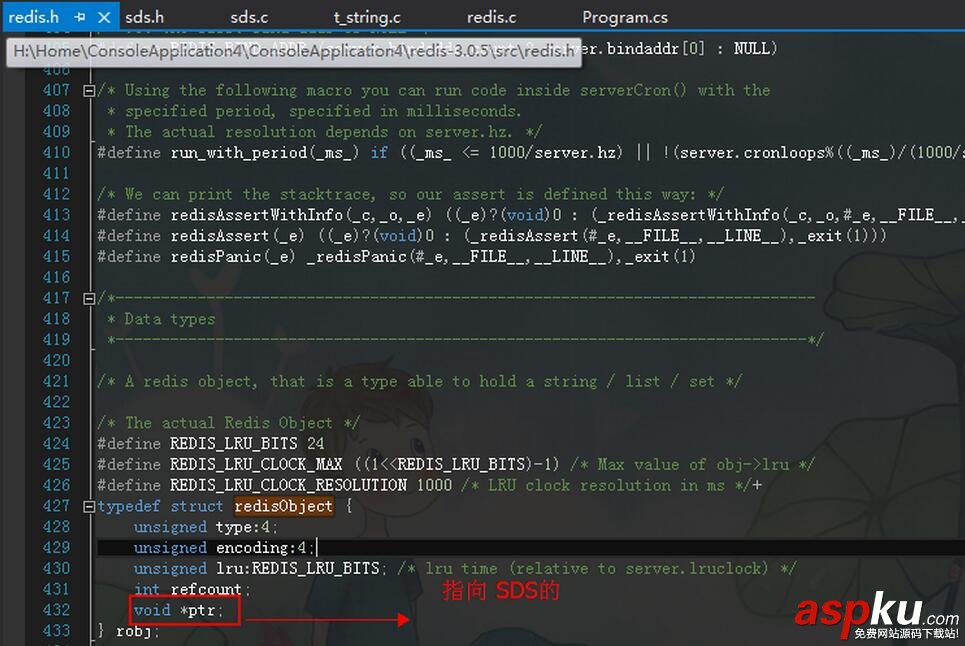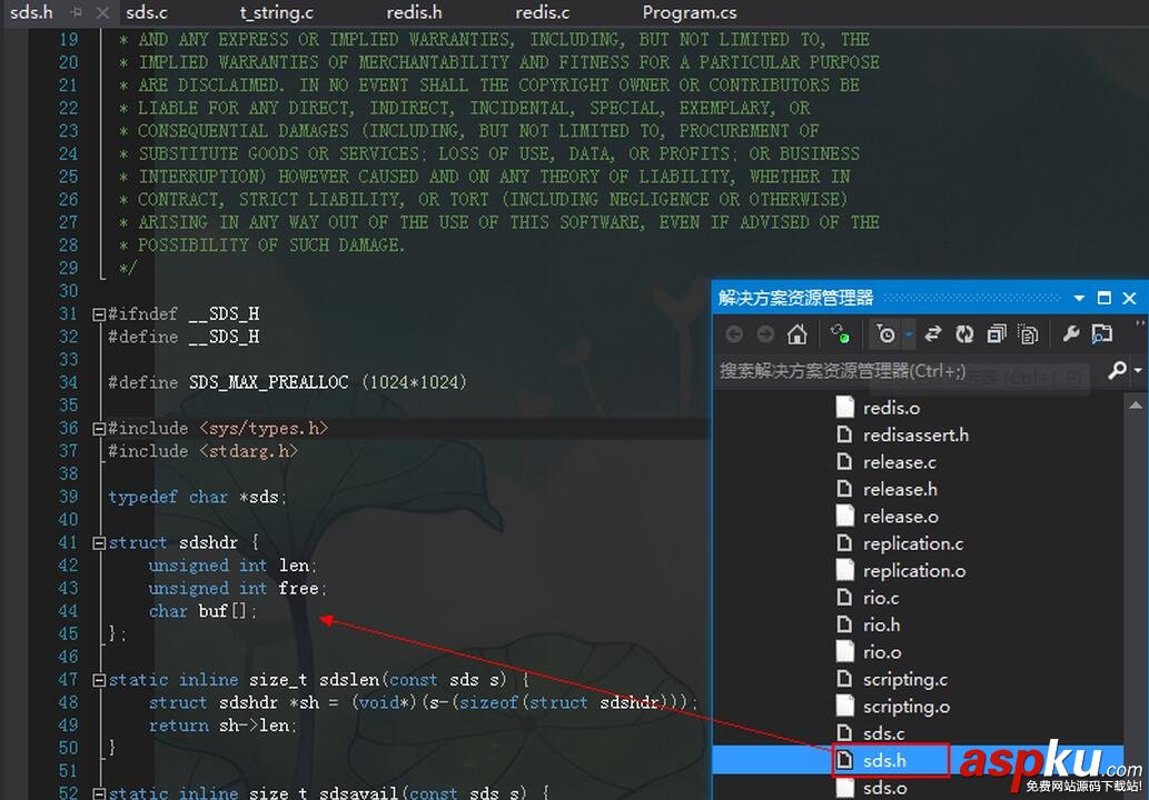 在redis里面是采用SDS(simple dynamic string)來封裝char[]的,這個也是redis存儲的最小單元,下一個問題就是哪里能看得到呢?我在wget壓縮包的時候,里面就有redis源碼啦,據說還只有3w多行,這就告訴我們,有什么問題,自己動手豐衣足食,對吧,為查找方便,我就把redis的源碼拖到window上用vs打開,接下來我們看看SDS長成啥樣???