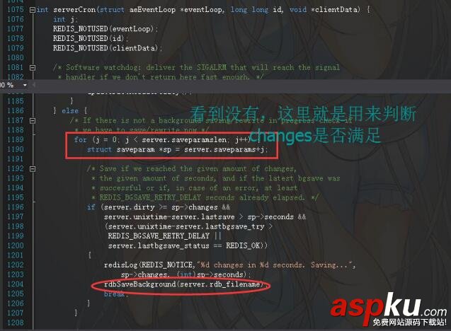 /* This is our timer interrupt, called server.hz times per second. * Here is where we do a number of things that need to be done asynchronously. * For instance: * * - Active expired keys collection (it is also performed in a lazy way on * lookup). * - Software watchdog. * - Update some statistic. * - Incremental rehashing of the DBs hash tables. * - Triggering BGSAVE / AOF rewrite, and handling of terminated children. * - Clients timeout of different kinds. * - Replication reconnection. * - Many more... * * Everything directly called here will be called server.hz times per second, * so in order to throttle execution of things we want to do less frequently * a macro is used: run_with_period(milliseconds) { .... } */int serverCron(struct aeEventLoop *eventLoop, long long id, void *clientData) {上面的紅色字體就是做了我們所關心的save操作,看過方法的注釋,接下來我們來找一下具體邏輯。