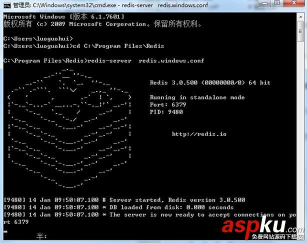 已經開啟了對應服務的,我們讓它保持,下面例子需要用到。如果沒有開啟的,我們命令開啟,進入Redis的安裝目錄(博主的是C:/Program Files/Redis),然后如下命令開啟: