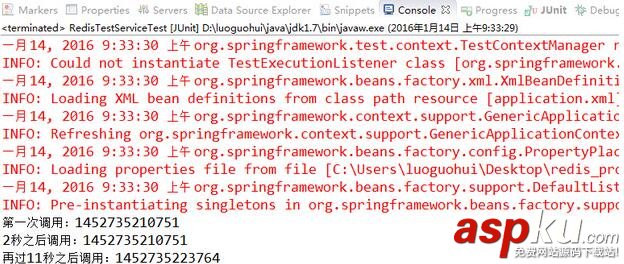 package com.luo.baseTest; import org.junit.runner.RunWith; import org.springframework.test.context.ContextConfiguration; import org.springframework.test.context.junit4.AbstractJUnit4SpringContextTests; import org.springframework.test.context.junit4.SpringJUnit4ClassRunner; //指定bean注入的配置文件 @ContextConfiguration(locations = { "classpath:application.xml" }) //使用標準的JUnit @RunWith注釋來告訴JUnit使用Spring TestRunner @RunWith(SpringJUnit4ClassRunner.class) public class SpringTestCase extends AbstractJUnit4SpringContextTests { } package com.luo.service; import org.junit.Test;import org.springframework.beans.factory.annotation.Autowired; import com.luo.baseTest.SpringTestCase; public class RedisTestServiceTest extends SpringTestCase { @Autowired private RedisTestService redisTestService; @Test public void getTimestampTest() throws InterruptedException{ System.out.println("第一次調用:" + redisTestService.getTimestamp("param")); Thread.sleep(2000); System.out.println("2秒之后調用:" + redisTestService.getTimestamp("param")); Thread.sleep(11000); System.out.println("再過11秒之后調用:" + redisTestService.getTimestamp("param")); } } 3.7、運行結果: