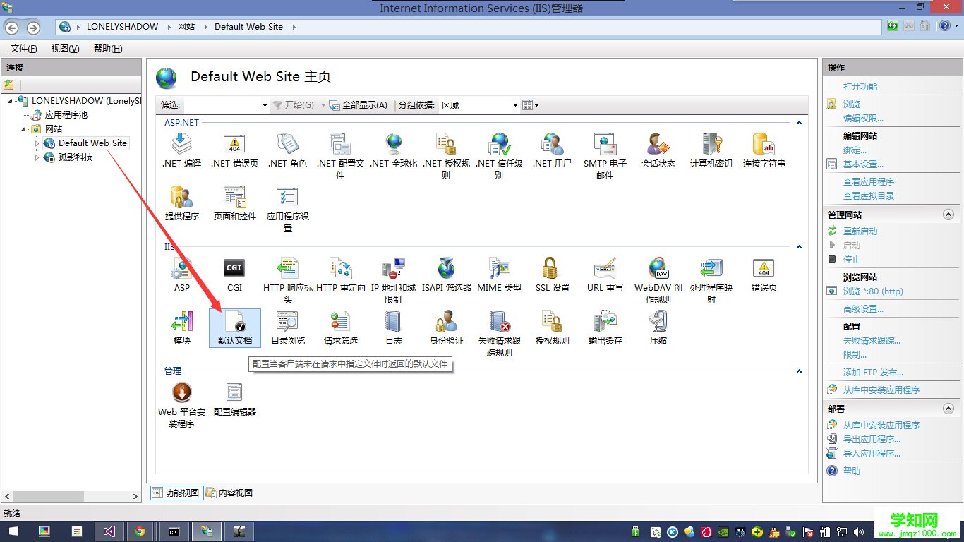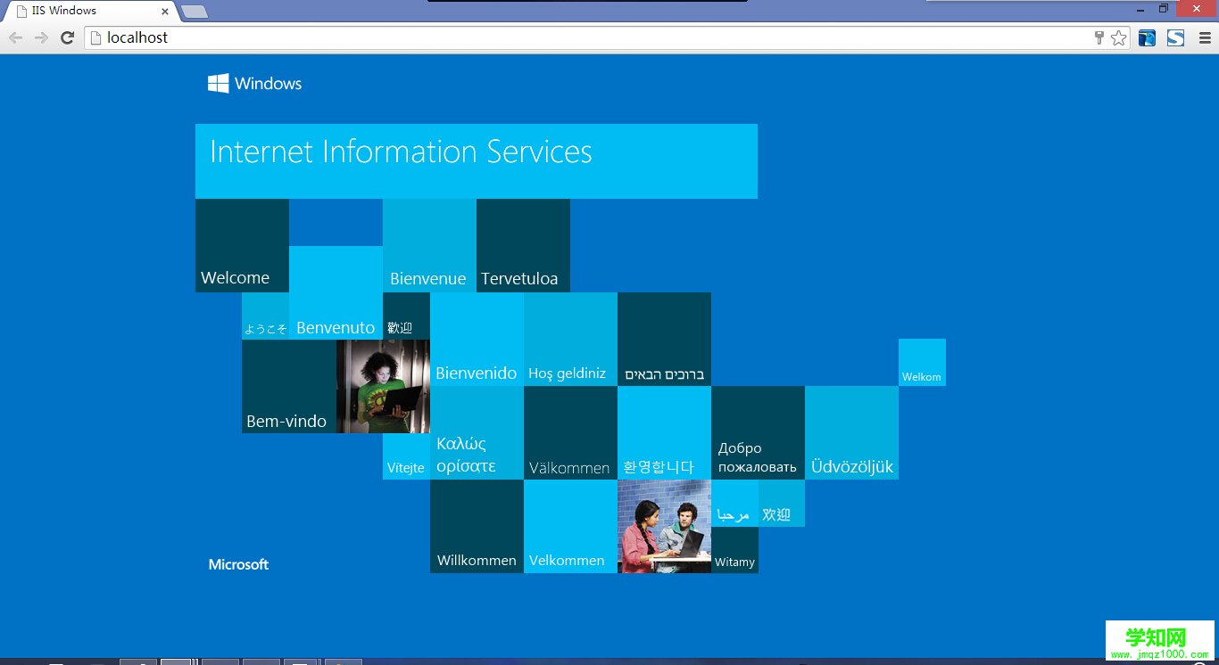 左側網站中會有一個默認站點“Default Web Site”,默認自動啟動的,我們訪問"http://localhost",會顯示IIS 8的歡迎界面,表示IIS啟用成功: