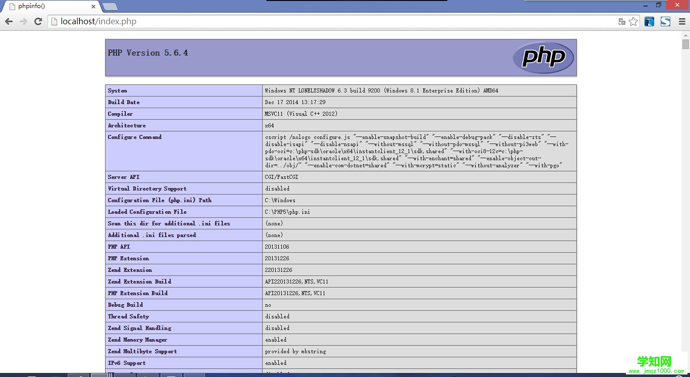 然后,訪問“http://localhost/index.php”,便可以看到PHP的信息頁面: