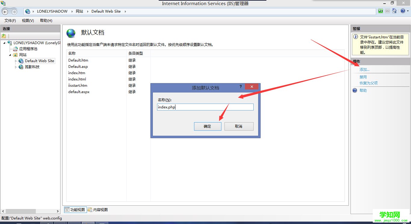 然后,點擊網站,右側的“默認文檔”中,添加php的默認頁面“index.php”項: