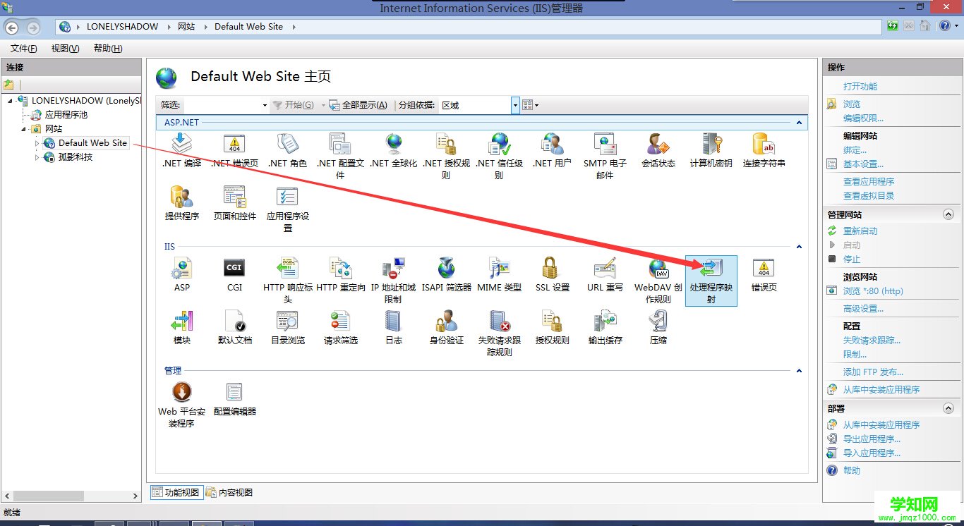 4. 啟用IIS的PHP支持回到IIS管理中心,點擊目標網站,在右側找到“處理程序映射”: