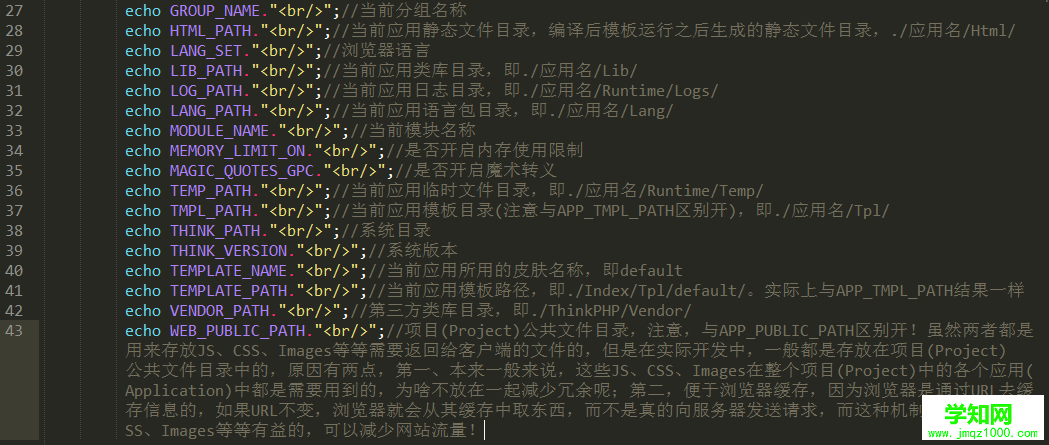 1 echo __ROOT__.'<br/>';//網(wǎng)站根目錄,即Apache的htdocs目錄/html' target='_blank'>虛擬主機(jī)下的當(dāng)前項(xiàng)目(Project)目錄 2 echo __APP__.'<br/>';//當(dāng)前應(yīng)用(Application)入口文件地址 3 echo __URL__.'<br/>';//當(dāng)前模塊地址 4 echo __ACTION__.'<br/>';//當(dāng)前動(dòng)作地址 5 echo __SELF__.'<br/>';//當(dāng)前RUL地址,即此時(shí)瀏覽器地址欄中顯式的URL地址!所謂顯式就是瀏覽器地址欄是啥這個(gè)常量就是啥,比如說訪問Index模塊的index動(dòng)作,模塊名和動(dòng)作名都是可以省略的,當(dāng)然也是可以帶上的,那么顯然這兩種情況中瀏覽器地址欄中的URL地址就不一樣了,那么該常量也就是不一樣咯! 6 echo __CURRENT__.'<br/>';//當(dāng)前模塊對應(yīng)的模板目錄 7 echo ACTION_NAME.'<br/>';//當(dāng)前動(dòng)作名稱 8 echo APP_PATH.'<br/>';//當(dāng)前應(yīng)用目錄,注意,是相對于單入口文件的 9 echo APP_NAME.'<br/>';//當(dāng)前應(yīng)用名稱10 echo APP_TMPL_PATH.'<br/>';//當(dāng)前應(yīng)用模板目錄,即皮膚目錄11 echo APP_PUBLIC_PATH.'<br/>';//當(dāng)前應(yīng)用公共文件目錄,注意這個(gè)輸出是當(dāng)前應(yīng)用模板(皮膚)目錄下的Public目錄12 echo CACHE_PATH.'<br/>';//當(dāng)前應(yīng)用緩存目錄,即./應(yīng)用名/Runtime/Cache/,就是編譯后模板目錄13 echo CONFIG_PATH.'<br/>';//當(dāng)前應(yīng)用配置文件目錄14 echo COMMON_PATH.'<br/>';//當(dāng)前應(yīng)用公共文件目錄(注意,與APP_PUBLIC_PATH不同),即./應(yīng)用名/Common/15 echo DATA_PATH.'<br/>';//當(dāng)前應(yīng)用數(shù)據(jù)文件目錄,即./應(yīng)用名/Runtime/Data/。存放的是與數(shù)據(jù)庫表結(jié)構(gòu)相關(guān)的數(shù)據(jù)文件,因?yàn)門hinkPHP會(huì)自動(dòng)緩存表相關(guān)的結(jié)構(gòu)信息16 echo GROUP_NAME.'<br/>';//當(dāng)前分組名稱17 echo HTML_PATH.'<br/>';//當(dāng)前應(yīng)用靜態(tài)文件目錄,編譯后模板運(yùn)行之后生成的靜態(tài)文件目錄,./應(yīng)用名/Html/18 echo LANG_SET.'<br/>';//瀏覽器語言19 echo LIB_PATH.'<br/>';//當(dāng)前應(yīng)用類庫目錄,即./應(yīng)用名/Lib/20 echo LOG_PATH.'<br/>';//當(dāng)前應(yīng)用日志目錄,即./應(yīng)用名/Runtime/Logs/21 echo LANG_PATH.'<br/>';//當(dāng)前應(yīng)用語言包目錄,即./應(yīng)用名/Lang/22 echo MODULE_NAME.'<br/>';//當(dāng)前模塊名稱23 echo MEMORY_LIMIT_ON.'<br/>';//是否開啟內(nèi)存使用限制24 echo MAGIC_QUOTES_GPC.'<br/>';//是否開啟魔術(shù)轉(zhuǎn)義25 echo TEMP_PATH.'<br/>';//當(dāng)前應(yīng)用臨時(shí)文件目錄,即./應(yīng)用名/Runtime/Temp/26 echo TMPL_PATH.'<br/>';//當(dāng)前應(yīng)用模板目錄(注意與APP_TMPL_PATH區(qū)別開),即./應(yīng)用名/Tpl/27 echo THINK_PATH.'<br/>';//系統(tǒng)目錄28 echo THINK_VERSION.'<br/>';//系統(tǒng)版本29 echo TEMPLATE_NAME.'<br/>';//當(dāng)前應(yīng)用所用的皮膚名稱,即default30 echo TEMPLATE_PATH.'<br/>';//當(dāng)前應(yīng)用模板路徑,即./Index/Tpl/default/。實(shí)際上與APP_TMPL_PATH結(jié)果一樣31 echo VENDOR_PATH.'<br/>';//第三方類庫目錄,即./ThinkPHP/Vendor/32 echo WEB_PUBLIC_PATH.'<br/>';//項(xiàng)目(Project)公共文件目錄,注意,與APP_PUBLIC_PATH區(qū)別開!雖然兩者都是用來存放JS、CSS、Images等等需要返回給客戶端的文件的,但是在實(shí)際開發(fā)中,一般都是存放在項(xiàng)目(Project)公共文件目錄中的,原因有兩點(diǎn),第一、本來一般來說,這些JS、CSS、Images在整個(gè)項(xiàng)目(Project)中的各個(gè)應(yīng)用(Application)中都是需要用到的,為啥不放在一起減少冗余呢;第二,便于瀏覽器緩存,因?yàn)闉g覽器是通過URL去緩存信息的,如果URL不變,瀏覽器就會(huì)從其緩存中取東西,而不是真的向服務(wù)器發(fā)送請求,而這種機(jī)制對于加載JS、CSS、Images等等有益的,可以減少網(wǎng)站流量!