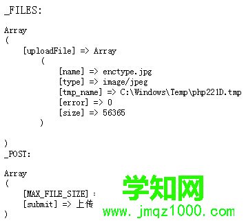 現(xiàn)在回過頭看FILE數(shù)組的鍵名代表的信息,type是MIME類型,以/分隔,前面是主要類型,后面是具體文件類型,error肯定表示錯誤,有這么幾種情況,0:沒有錯誤,上傳成功; 1:文件超過了PHP配置指令中的upload_max_filesize規(guī)定的大小; 2:文件超過HTML表單中MAX_FILE_SIZE規(guī)定的大小,3:文件只有部分上傳; 4:沒有文件上傳。現(xiàn)在關于FILES數(shù)組的問題全部明白了。