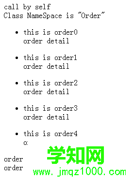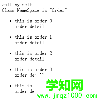 Order.php 的內容為 1 <?php 2 /** 3 * @Author: Martin 4 * @Support: Martin 5 * @Last Modified by: Martin 6 */ 7 namespace Order; 8 9 const STR = 'order list<br />';10 11 function detail()12 {13 return 'order detail<br />';14 }15 function call_by_self()16 {17 return 'call by self<br />';18 }19 /**20 *21 */22 class Orderlist23 {24 25 public function __construct()26 {27 echo 'Class NameSpace is "', __NAMESPACE__, '"';28 }29 public function show_list()30 {31 for ($i = 0; $i < 5; $i++) {32 echo "<ul><li>this is order$i<br />";33 //內部直接訪問34 echo detail();35 echo "</li></ul>";36 }37 }38 }39 //內部通過命名空間訪問40 echo /Order/call_by_self();index.php 內容為: