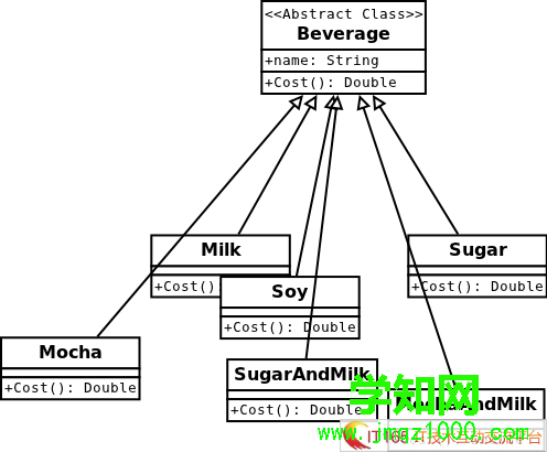 有這樣一個項目,做一個餐廳訂餐系統。起初的代碼結構是這樣的。前面有很多Beverage的繼承類,現在遇到的問題是牛奶的價錢上漲了,那么所有相關的類,我們都要進行調整,比如Milk,SugarAndMilk類,這種類還有很多,我們需要逐個去修改類中的方法——開發人員每次都做這種事情,要瘋了!所以我們要改變現有的結構。以下的圖都是簡圖,實際的圖,可沒有這么簡單。