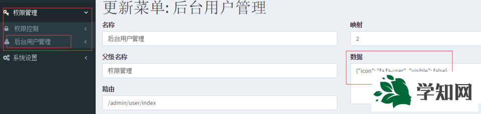 還記得我們一開始創建菜單的時候,唯一沒進行填寫的選項'數據'嗎?為了后續操作方便,我們這里一并把圖標和隱藏的選項都填寫上。我們以開始截圖中的'后臺用戶管理'這個二級菜單為例進行修改。截圖大家先看看我們的菜單目前的狀態,