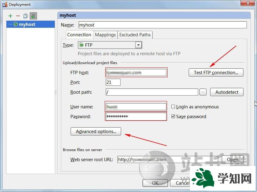 3.填好你的FTP的信息,填完可以點“Test FTP Connection”測試一下連接是否成功,如圖: