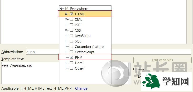 4.Live Templates代碼片斷A)我們先介紹一個代碼片段最基本的功能,我們要實現(xiàn)的目標是在html文件或者php文件里打入“quan”這4個字符,怎么實現(xiàn)呢?