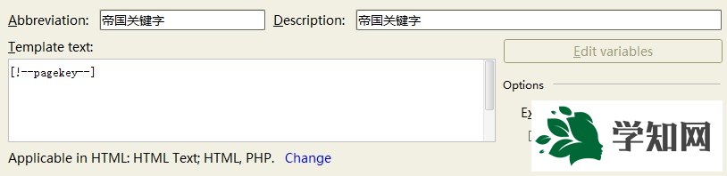 8)下面重復2–6步,點右邊的+號,選擇Live Templates,Abbreviation里輸入“帝國關鍵字”(這個與你在枚舉函數(shù)里輸入的參數(shù)是一樣的),Description 隨便你寫不寫,你也可以寫上“帝國關鍵字”,這個無所謂;Template text 里輸入帝國的關鍵字標簽“[!–pagekey–]”,“Define”點一下,設置html和php打勾