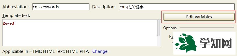5).Template text是代碼片斷的內(nèi)容,這次和前面有所不同,我們要輸入一個變量“$var$”,輸入以后會發(fā)現(xiàn)右邊那個本來灰色的按鈕“Edit variables”變成可點狀態(tài)了,如下圖紅框所示,等一下我們設置這個。