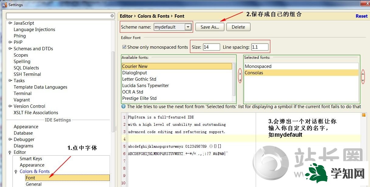 如果你想局部修改編輯器字體,可以點開“Colors & Fonts”前面的小標記,下面有個“Font”,點中它,右邊出現(xiàn)一些選項,注意:這時候這些參數(shù)是不能修改的,所以第一步我們就是要先Save As…保存成自己的風格,然后取一個名字如mydefault,然后我們就可以為所欲為了,哈哈。