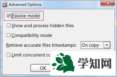 4.點開前面圖中的“Advanced options”按鈕,彈出如下對話框,勾選“Passive mode”被動模式:
