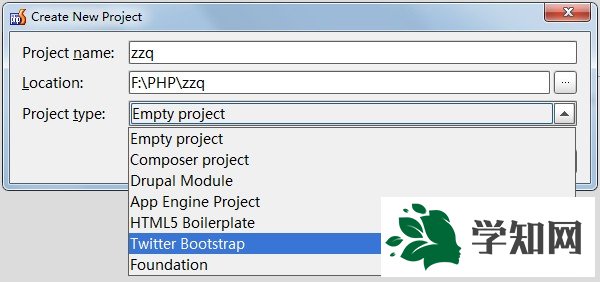 “Project name”是項目名稱,不要被“項目”這兩個字嚇到了,它其實就是你要放文件的一個文件夾名字,“Location” 就是你文件夾要放的路徑,“Project type”是項目的類型,這也是phpstorm的一個特別功能,如果你要建的是一個空項目,可以選默認的“Empty project”,空項目里會默認有一個.idea文件夾。同時,phpstorm也為你準備好了一些其他項目,比如我們建一個“Twitter Bootstrap”,它是一款微博的先驅Twitter推出的前端框架利器,步驟如下: