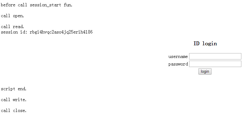 } } ?><html> <head> <title>Session Test</title> </head> <body> <form action="login.php" method="post"> <table align="center" > <caption><h3>ID login</h3></caption> <tr> <td>username</td> <td><input type="text" name="user" /></td> </tr> <tr> <td>password</td> <td><input type="password" name="pass" /></td> </tr> <tr> <td colspan="2" align="center"> <input type="submit" name="sub" value="login" /> </td> </tr> </table> </form> </body></html><?php echo '<br>script end.<br>'; ?>結果如下: