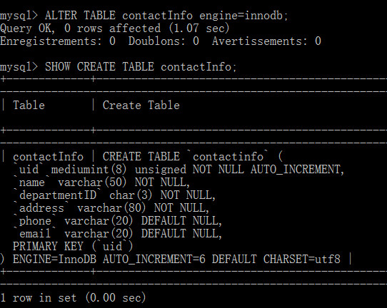 CREATE TABLE contactInfo( uid MEDIUMINT(8) UNSIGNED NOT NULL AUTO_INCREMENT, name VARCHAR(50) NOT NULL, departmentID CHAR(3) NOT NULL, address VARCHAR(80) NOT NULL, phone VARCHAR(20), email VARCHAR(20), PRIMARY KEY(uid));