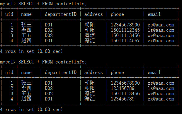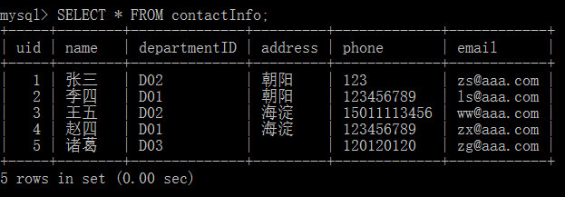 INSERT INTO contactInfo(name,departmentID,address,phone,email) VALUES ('張三','D01','朝陽','15011111234','zs@aaa.com'),('李四','D02','朝陽','15011112345','ls@aaa.com'),('王五','D02','海淀','15011113456','ww@aaa.com'),('趙四','D01','海淀','15011114567','zx@aaa.com');