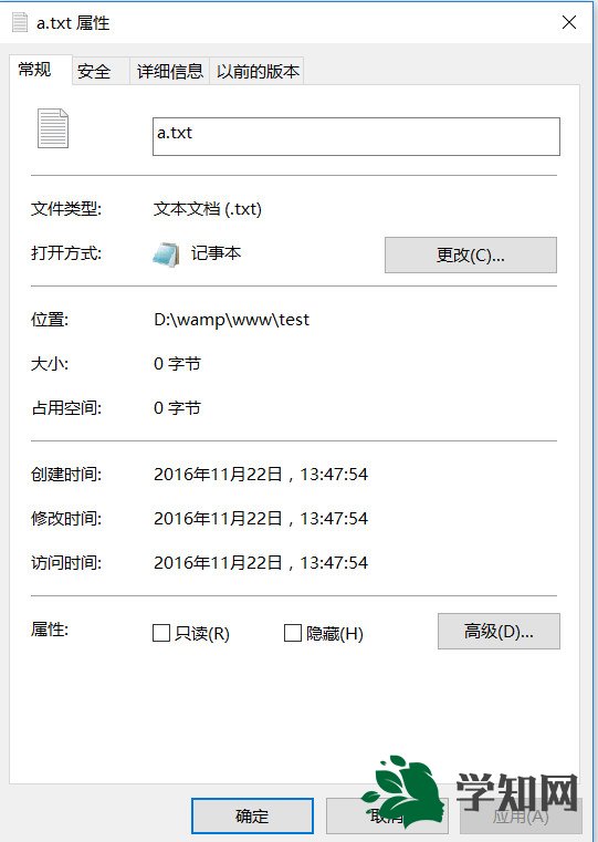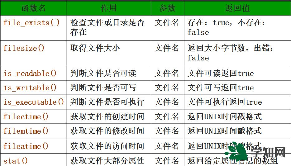 <?phpvar_dump (file_exists('test/a.txt')); //boolean truevar_dump (filesize('test/a.txt')); // int 0 var_dump (is_readable('test/a.txt')); //boolean truevar_dump (is_writeable('test/a.txt')); //boolean truevar_dump (is_executable('test/a.txt')); //boolean falsevar_dump (date('Y-m-d H:i:s',(filectime('test/a.txt'))));//string '2016-11-22 06:47:54' (length=19)var_dump (date('Y-m-d H:i:s',(filemtime('test/a.txt'))));//string '2016-11-22 06:47:54' (length=19)var_dump (date('Y-m-d H:i:s',(fileatime('test/a.txt'))));//string '2016-11-22 06:47:54' (length=19)?>