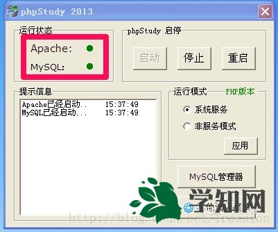 3、打開 PHPStudy ,我們將會看到這個界面,表示安裝成功,并已經啟動了Apache 和MySQL。(phpstudy 的端口號默認是80,如果有安裝IIS的同學請更改IIS端口號,或者在PHPStudy界面上點擊【其他選項菜單】→【phpstudy設置】→【端口常規設置】中更改端口號為8080或其他;)