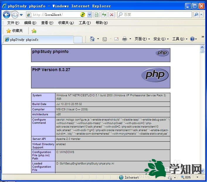 4、我們打開瀏覽器,在地址欄中輸入http://localhost(或者http://127.0.0.1),如果端口號為8080,則輸入http://localhost:8080(或者http://127.0.0.1:8080);當瀏覽器出現以下界面時就說明你的電腦可以允許PHP程序了!