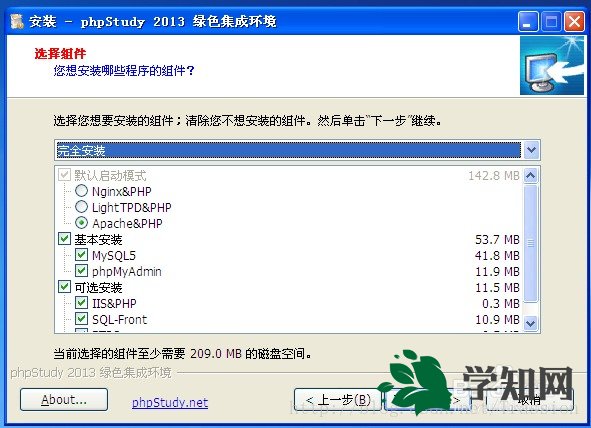 選擇完畢后【下一步】,選擇安裝組建,這里我們選擇默認,Apache + PHP + html' target='_blank'>MySQL5;