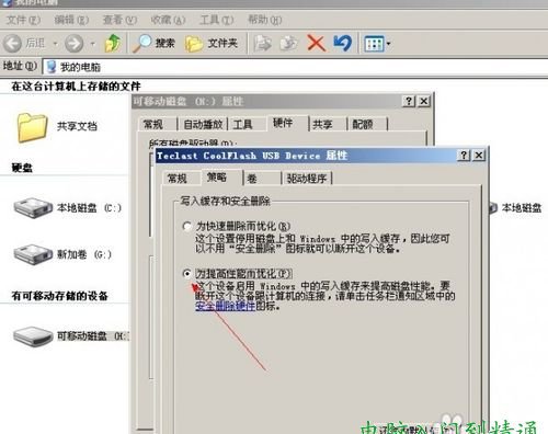 4、在打開的“屬性”對話框中,選擇“策略”,再選擇“為提高性能而優(yōu)化”;