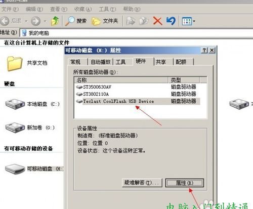 3、選擇“硬件”選項頁,在“名稱”中選擇你的U盤,單擊屬性;