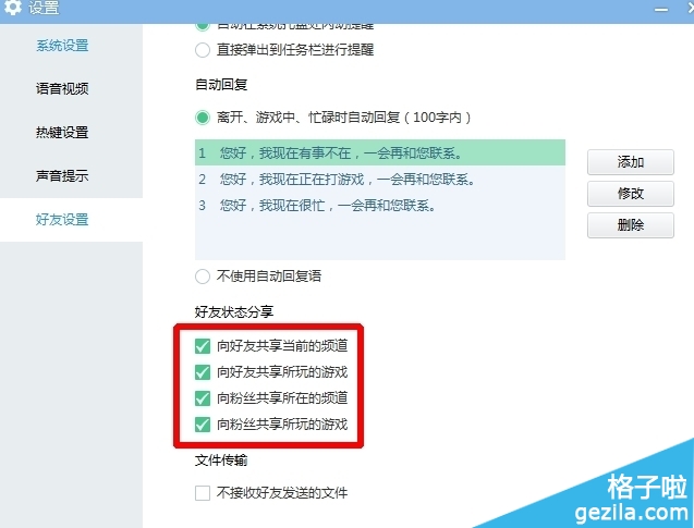 第二步驟;點擊“好友設置”然后將“向好友共享當前的頻道”、“向好友共享所玩的游戲”、“向粉絲打共享所在的頻道”、“向粉絲打共享所玩的游戲”打鉤點掉即可;