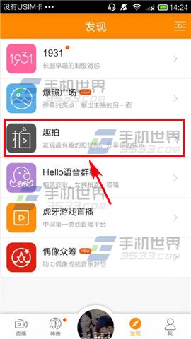 1)打開手機YY,進入首頁后點擊【發現】按鈕,接著點擊【趣拍】一項。(如下圖)