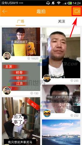 2)進入趣拍頁面后,點擊右上角的【攝像機】圖標,進入拍攝頁面,【點擊開拍】進行錄制。(如下圖)
