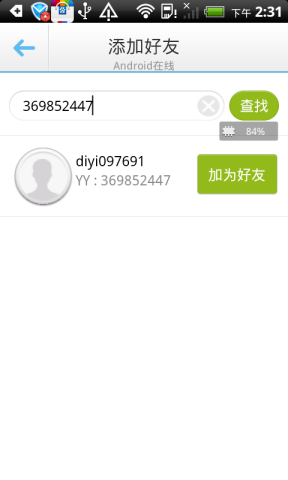 3、進(jìn)入“添加好友”界面后就會(huì)提示你輸入yy號(hào)查找接著點(diǎn)擊添加好友,