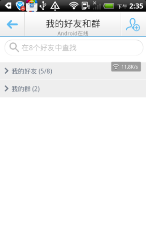 2、點(diǎn)擊后進(jìn)入了“我的好友和群”,繼續(xù)點(diǎn)擊屏幕右上角“添加好友”圖標(biāo)