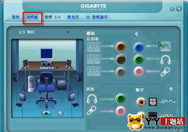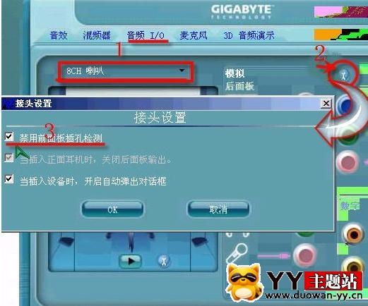 接著點一下最上面的音頻IO,按下圖標示1的位置,將喇叭數設為選擇8CH,這樣設聲音會大一些。然后再點2的位置,進入3,接頭設置,禁用前面板檢測,也就是,在前面打上對勾。