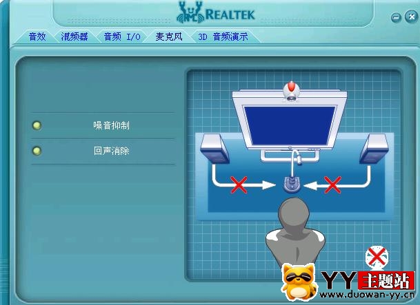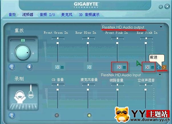 接下來看音頻輸出項(HD Audio output),注意只有我用紅色框圈住的那兩項,只有這兩項下面的小喇叭上有小紅X,其余的都不要打紅X。也就是說,只有這項要設為靜音,其它的都不要。這兩項要設為靜音,否則連麥時會有回音。