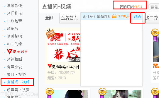 2.點擊“頻道排行” → “娛樂大廳” →“直播間·視頻”→點擊頁面右上角的“我的訂閱”→選擇想要取消通知的主播昵稱→點擊主播昵稱后的“取消”即可;