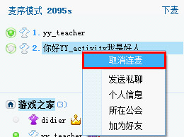 2、管理員如何進行YY連麥?相對于1號麥用戶自己進行連麥,管理員操作也差不多的進行,直接點擊2號麥用戶,然后右鍵選擇連麥,取消連麥的步驟也差不多。所以小編就不在這里和大家詳細說明了,自己多進行操作即可。