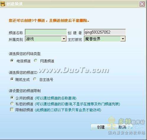 2.輸入頻道名稱,填寫頻道主打游戲。寫入簡單的頻道介紹,選擇所要建立的頻道用戶主要的網絡類型。