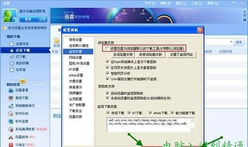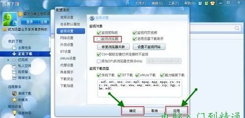 1.3. 選擇“配置面板”窗口的左邊菜單“監視設置”            1.4. 取消第一個選項    取消第一個選項:“迅雷為瀏覽器默認的下載工具(IE和默認瀏覽器)”            1.5. 點擊“應用”,然后再點擊“確定”    取消了第一項的“勾選”后,先點擊下方“應用”按鈕,然后再點擊“確定”按鈕。            1.6. 完成修改 完成修改。