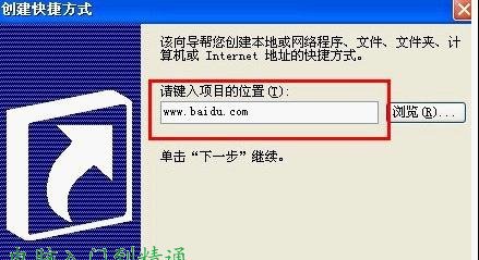 出現創建快捷方式對話框,在“請鍵入項目的位置”中填寫要鏈接的地址,如果是本地文件或文件夾,可以通過右邊的瀏覽按鈕進行選擇。這里以在桌面創建百度的快捷方式為例:輸入www.baidu.com,單擊下一步。     在“鍵入該快捷方式的名稱”中填寫“百度”。單擊完成。這里的名稱僅僅是一個備注名稱,讓創建者日后明白這個鏈接是干什么用的,其本身對快捷方式的使用沒有影響。