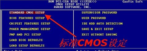 重啟電腦立即按Delete鍵進入BIOS程序, BIOS因生產廠家不同而有所不同,但大同小異,在Standard CMOS Setup(標準CMOS設定)選項按回車鍵進入子選項,