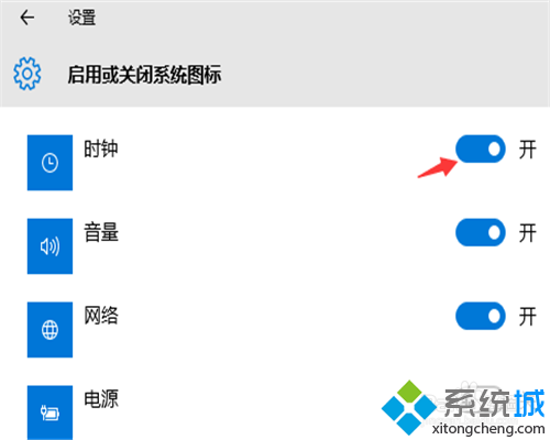 5、然后在“啟用或關(guān)閉系統(tǒng)圖標(biāo)”中就會(huì)看到“時(shí)鐘”,那么下圖中“時(shí)鐘”后面的開關(guān)顯示的為“開”,只需用鼠標(biāo)點(diǎn)擊一下,就可以“關(guān)閉”了。