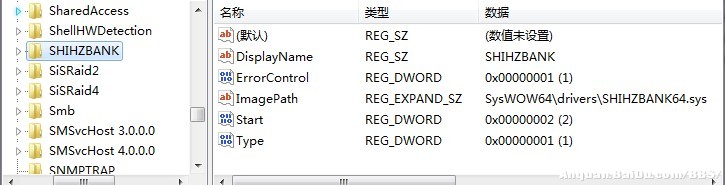 請點擊開始-運行,輸入regedit打開注冊表后定位到HKEY_LOCAL_MACHINESYSTEMCurrentControlSetServices下,點擊編輯-查找,輸入shihzbank64.sys,搜索到的鍵中ImagePath字段就是驅動文件具體目錄,如圖所示