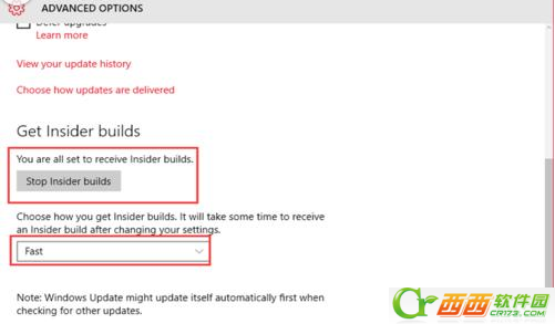 3、進入“Advanced options”窗口,可以看到“You are all set to receive Insider builds”下方顯示的是“Stop Insider builds”,說明是win10的Insider,這時還必須在下方的下拉框中選擇“Fast”;