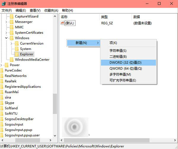2、定位到 HKEY_CURRENT_USERSOFTWAREPoliciesMicrosoftWindowsExplorer