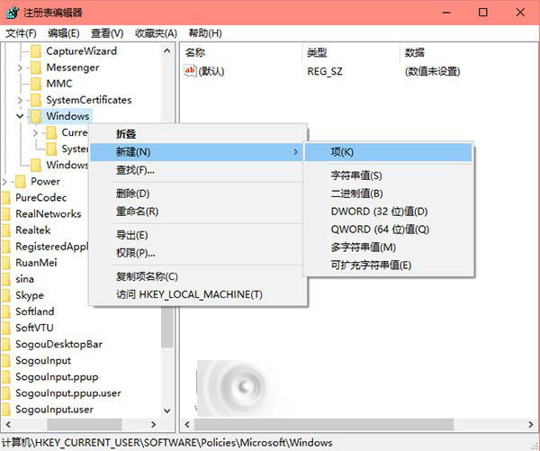 注意,若沒有“Explorer”項,可自己新建一個(在Windows文件夾上點右鍵,選擇新建→項,如下圖)
